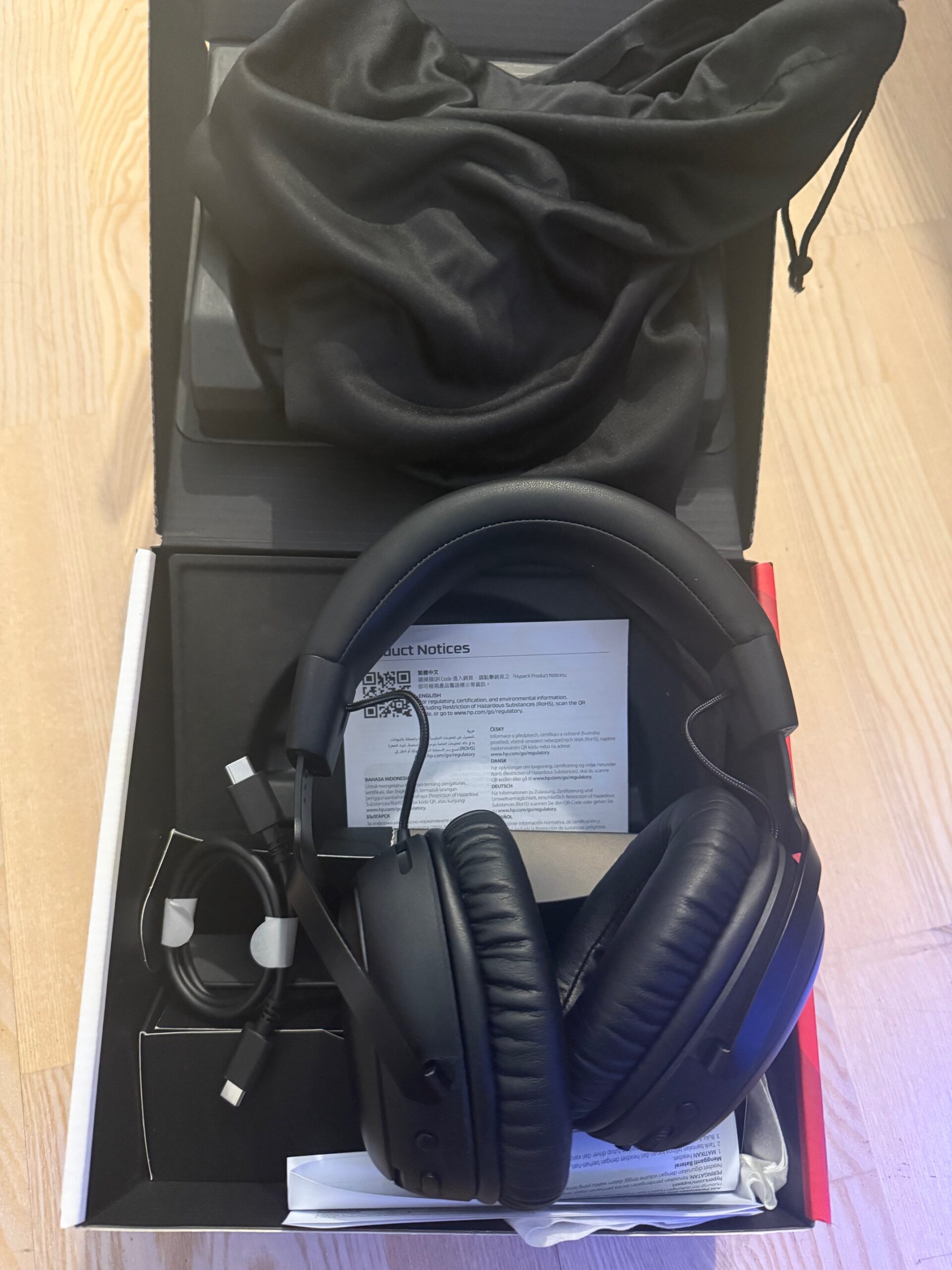 Når man åbner æsken, forstår man hurtigt HyperX’ filosofi. Her er ingen overflødige plastikindlæg, skumlag eller kabelfest. Indholdet er kort og kontant: headset, et USB-C til USB-C kabel (meget kort) og en lille stofpose til transport. Det er næsten asketisk – men samtidig elegant. HyperX bruger pengene dér, de gør en forskel: på selve produktet.