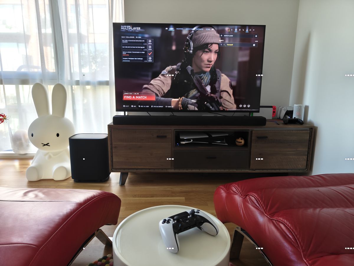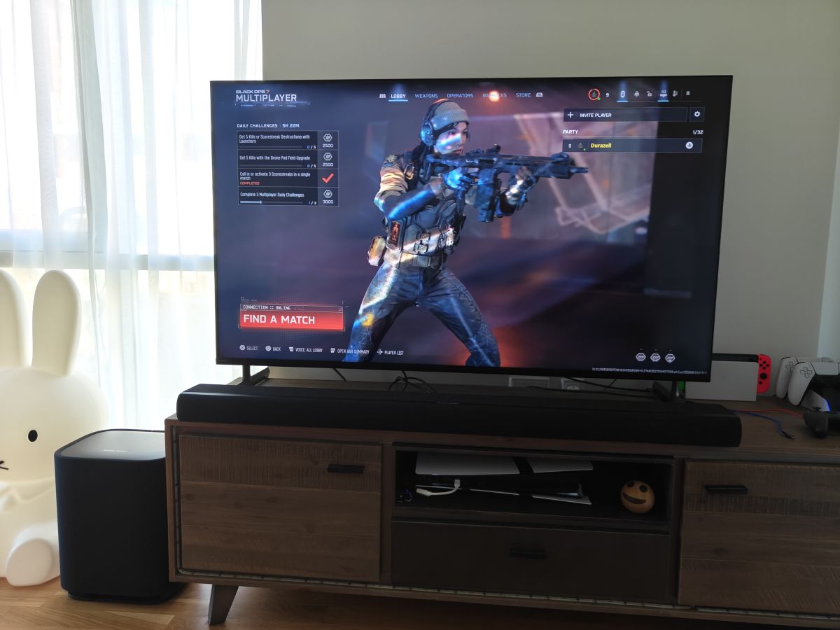 Det første, man bemærker ved Enchant 1100, er dens fremragende stemmereproduktion. Dialoger står klart og naturligt, og selv uden dedikerede baghøjttalere formår MultiBeam-teknologien at skabe en imponerende bred og dyb lydscene. Da vi er et gamingmagasin, har jeg naturligvis brugt en del tid med Enchant 1100 under Call of Duty: Black Ops 7-betaen, som kørte i starten af oktober. Her viser systemet virkelig sin styrke. Hvor det i mange spil kan være svært at høre, hvad der bliver sagt midt i kampens kaos, formår Enchant 1100 at omslutte dig med et næsten tredimensionelt lydbillede, hvor både stemmer, eksplosioner og baggrundslyde placeres præcist i rummet. Det er især fedt, at nogle af de mange højttalere automatisk formidler status i kampen tydeligt og præcist.