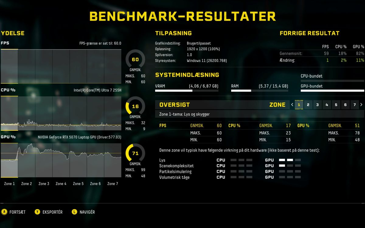 Med RTX 5070-chippen kan du forvente en oplevelse, der ligger tæt op ad tidligere generationers high-end modeller, men i et langt slankere format. Jeg har som sædvanlig anvendt Returnals indbyggende indstillingsoptimering som giver et godt indblik ind hvad der trækkes ud af maskinen. Da det presser den max så får jeg også en fornemmelse af støjniveauet. Det er alt sammen som forventet og endda mindre “jetmotor” er forventet. Det er effektivt køling.