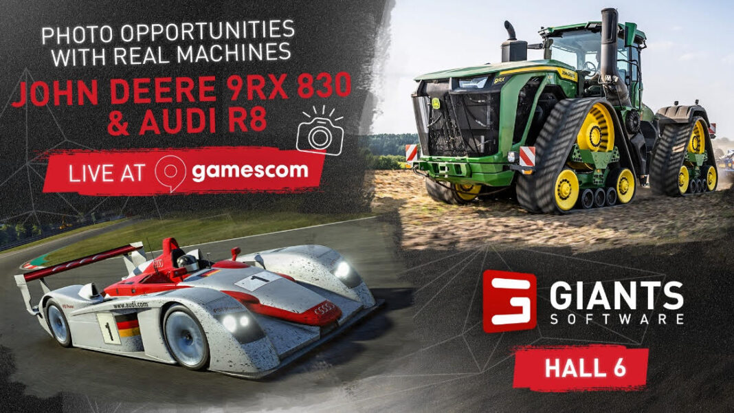 Hvis du dukker op til årets Gamecom i Køln mellem 20. og 24. august skal du gøre dig selv den tjeneste at tage forbi Hal 6 hvor du finder imponerende 1.500 hestekræfter fordelt mellem en John Deere 9RX 830 med 913 heste produceret af en 18-liter sekscylindrede motor. Hele herligheden er næsten 9 meter høj. Den er flankeret af Audi R8 der vandt Le Mans i 2002 hvor en V8 motor producerer 610 heste.